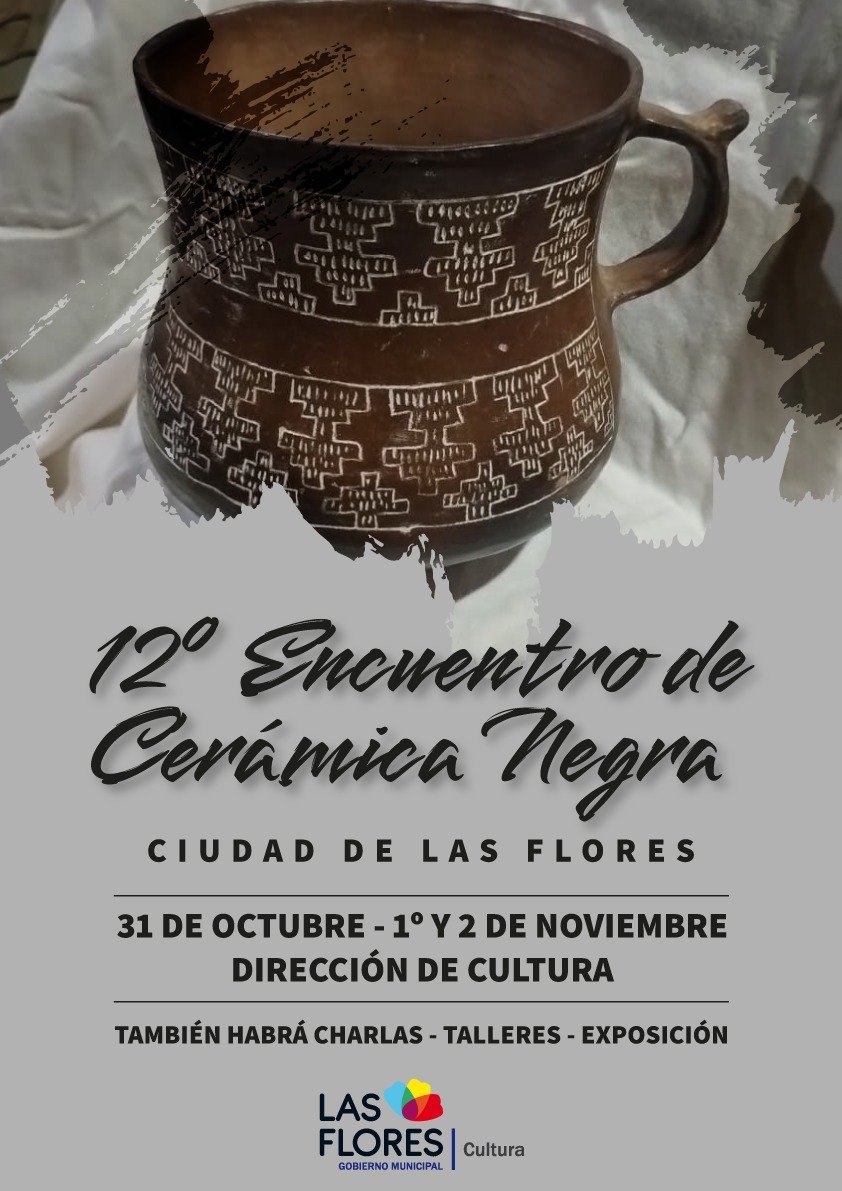 La Dirección Municipal de Cultura, con el acompañamiento y coordinación del prestigioso ceramista florense Carlos Lerra y la colaboración de las profesoras de los talleres municipales Rocío Arrazubieta y Paloma Calabria, invitan al 12° Encuentro Provincial de Cerámica Negra que se llevará a cabo en Las Flores los días 31 de octubre, 1 y 2 de noviembre de 2025.