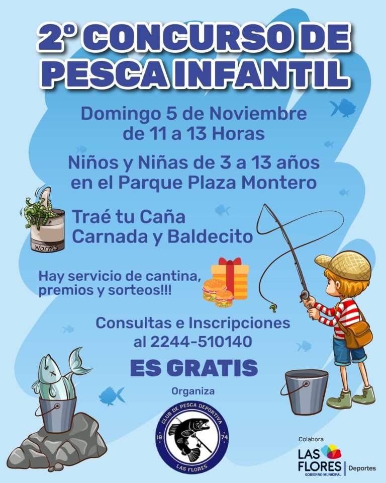 El Club del Pesca Deportiva Las Flores organiza para este domingo 5 de noviembre el 2°concurso de pesca infantil en el Parque Plaza Montero. Pueden anotarse niñas y niños de 3 a 13 años de forma gratuita y habrá servicio de cantina, premios y sorteos. Por consultas e inscripciones comunicarse al teléfono 02244-510140.