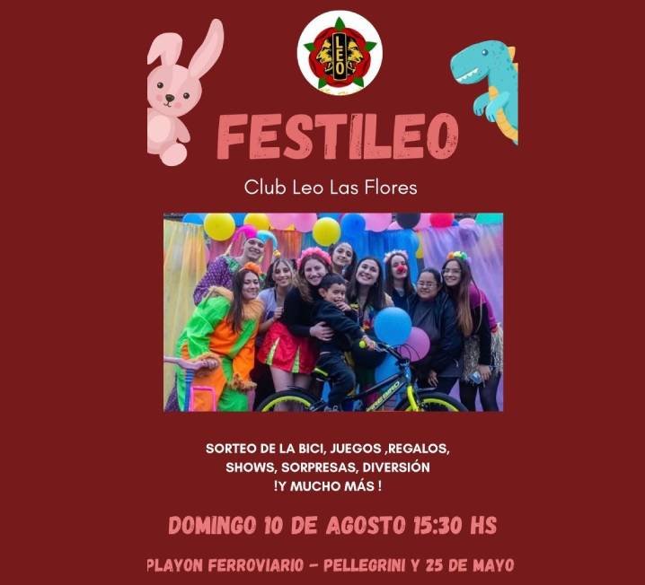 FESTILEO: El tradicional festejo por el Día de la Niñez del Club Leo Las Flores se va a realizar el domingo 10 de agosto a las 15hs en el Playon Ferroviario de Pellegrini y 25 de mayo. Habrá juegos, sorteos, shows, musica, entretenimiento y el sorteo de la bici como todos los años.