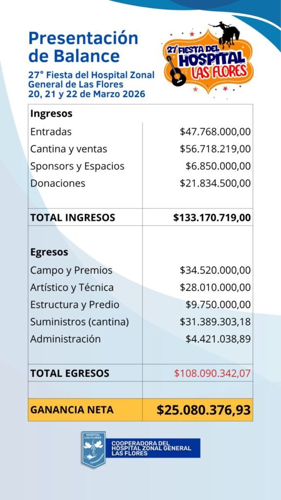 La Cooperadora del Hospital de Las Flores dio a conocer el balance correspondiente a la última fiesta realizada el 20, 21 y 22 de marzo pasado.