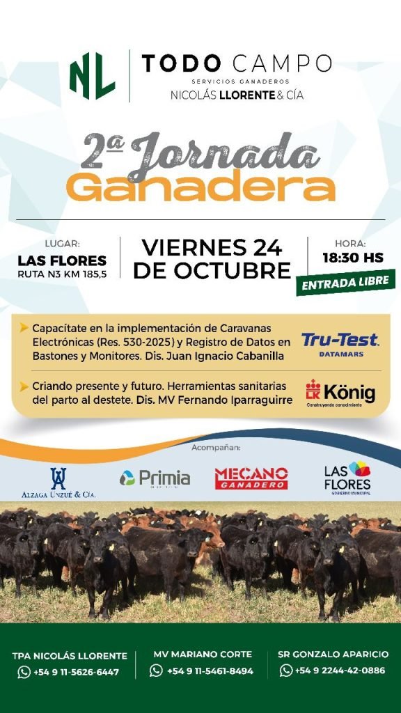 La firma Todo Campo – Nicolás Llorente & Cía. invita a participar de la 2ª Jornada Ganadera que se realizará el viernes 24 de octubre a las 18:30 horas en nuestra ciudad, en el local ubicado en Ruta N° 3, km 185,5.