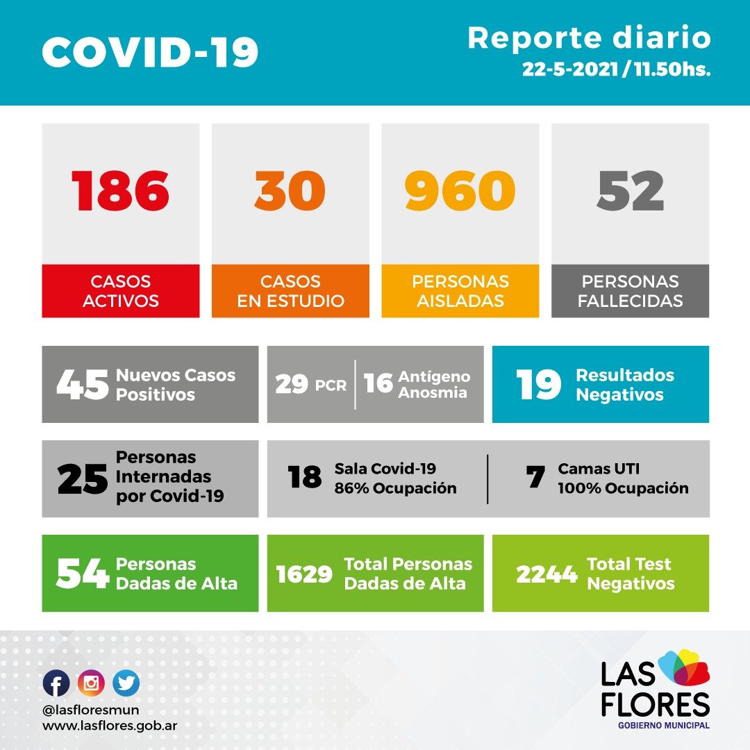 Ingresaron nuevos resultados arrojando 45 positivos, 29 por medio de hisopados PCR y 16 por test de antígeno, anosmia y 19 resultados negativos, y se dieron de alta a 54 pacientes activos.