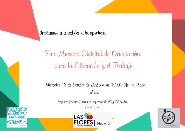 Jefatura Distrital invita a la 7° Muestra Distrital, Orientación para la Educación y Trabajo OEyT  a llevarse a cabo el día 18 de octubre a partir de las 10 horas en el playón de Plaza Mitre de Las Flores.