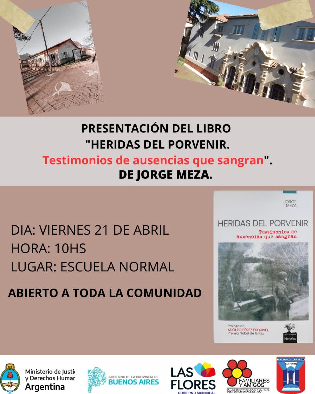 La Comisión de Familiares y Amigos de los Desaparecidos y Victimas del Terrorismo de Estado de Las Flores invitan a la presentación del libro “Heridas del porvenir» Testimonios de ausencias que sangran del profesor Jorge Meza.