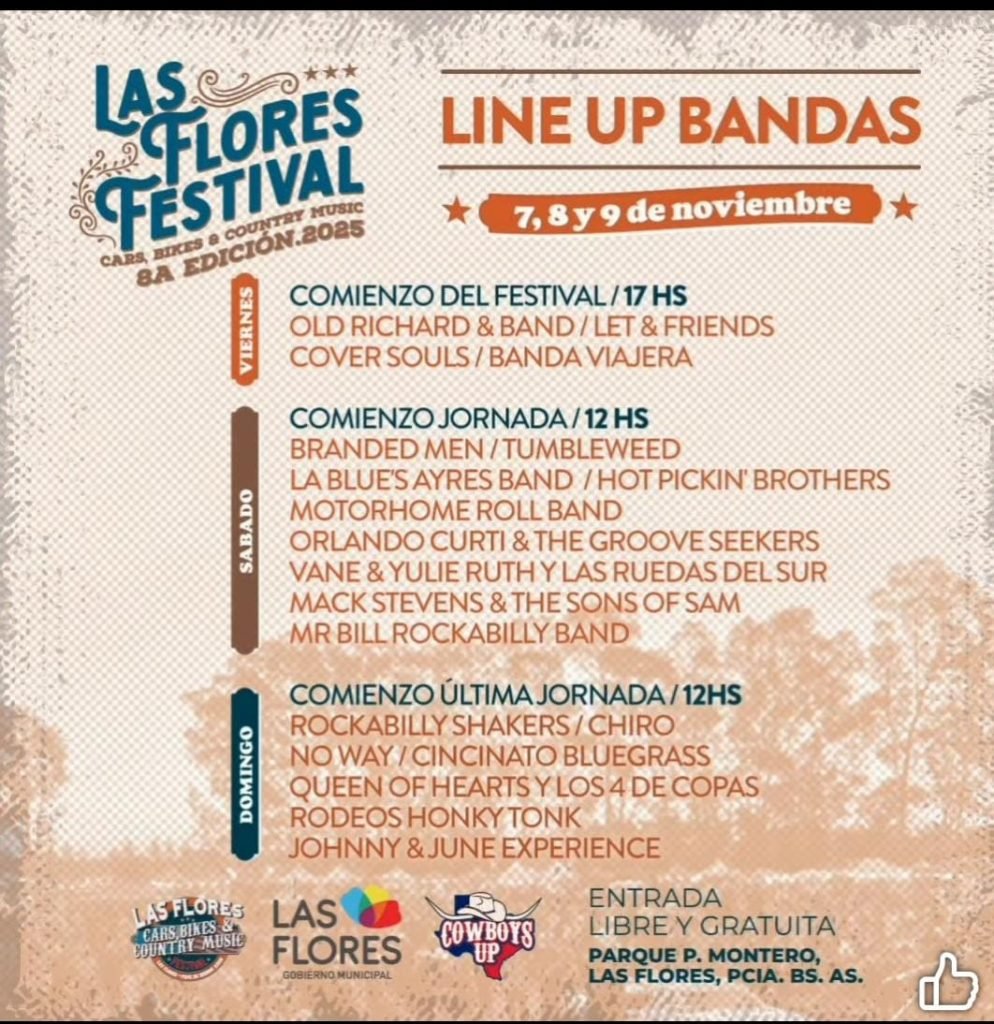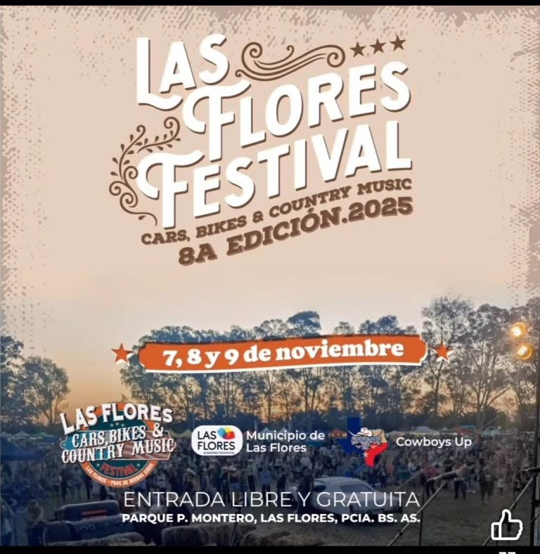 Hoy empieza el 8vo. “Las Flores Festival: cars, bikes and country music”. El evento que año tras año convoca a miles de personas de distintos puntos del país y del exterior que esperan con gran expectativa esta fecha. Nuestra ciudad recibe público que llega para disfrutar de bandas de música country en vivo, exposición de autos y motos clásicos, desfiles de vaqueras, clases de danza y más. Todo en un entorno amplio y natural como es el Parque Plaza Montero -la laguna-. Además con patio de comidas, food tracks y paseo de artesanos.