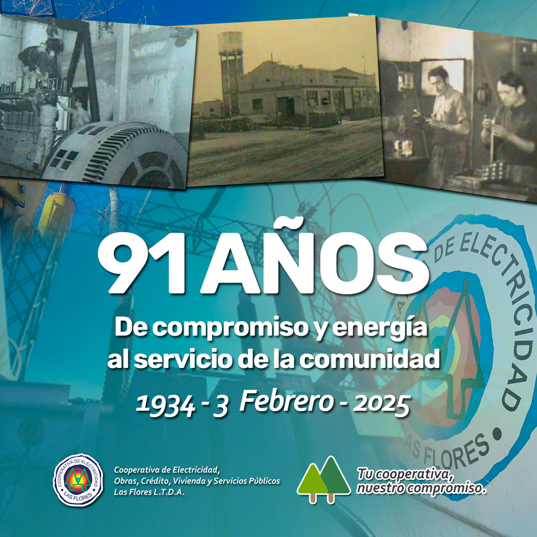 Este 3 de febrero, la Cooperativa de Electricidad Obras, Crédito y Servicios Públicos de Las Flores Ltda. celebra con orgullo su 91° aniversario, reafirmando su compromiso con el desarrollo y bienestar de la comunidad.
