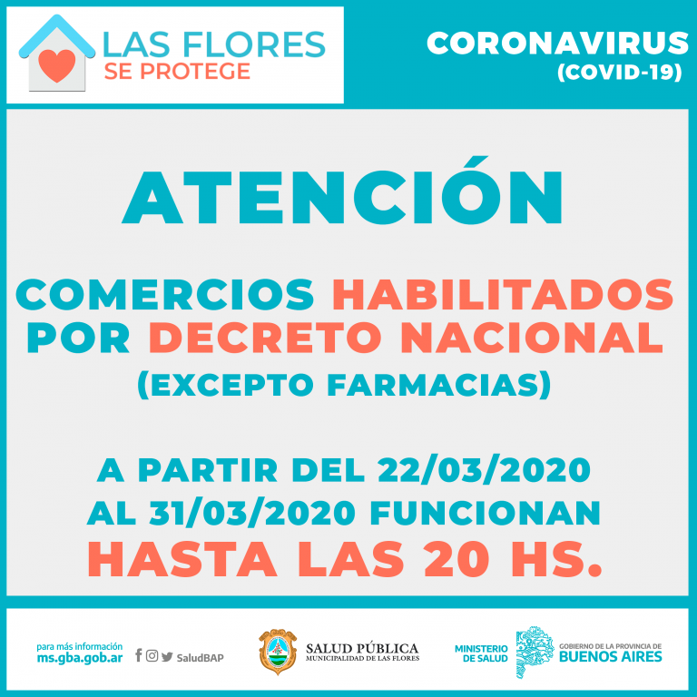 La Municipalidad de Las Flores comunica que, luego de efectuar un seguimiento del cumplimiento del Aislamiento Social Preventivo Obligatorio en nuestra ciudad y de evaluar las sugerencias de los representantes de la Comisión de Emergencia y el acuerdo alcanzado entre FAECYS y la Asociación de Supermercados Unidos, se ha resuelto que a partir del día DOMINGO 22 de MARZO de 2020 y hasta el día 31 de MARZO de 2020, inclusive, los comercios habilitados para funcionar de acuerdo a lo previsto en el Decreto 297/2020, deberán cerrar sus puertas a la HORA VEINTE (20 hs.).