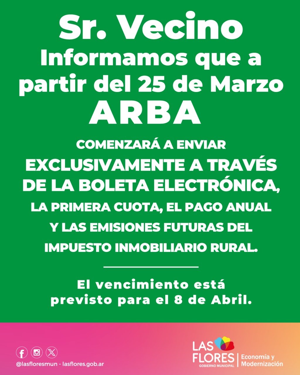 La Secretaría de Economía y Modernización informa que la Agencia de Recaudación de la Provincia de Buenos Aires (ARBA), comenzará desde hoy 25 de marzo a enviar exclusivamente a través de la boleta electrónica, la primera cuota, el pago anual y las emisiones futuras del Impuesto Inmobiliario Rural.