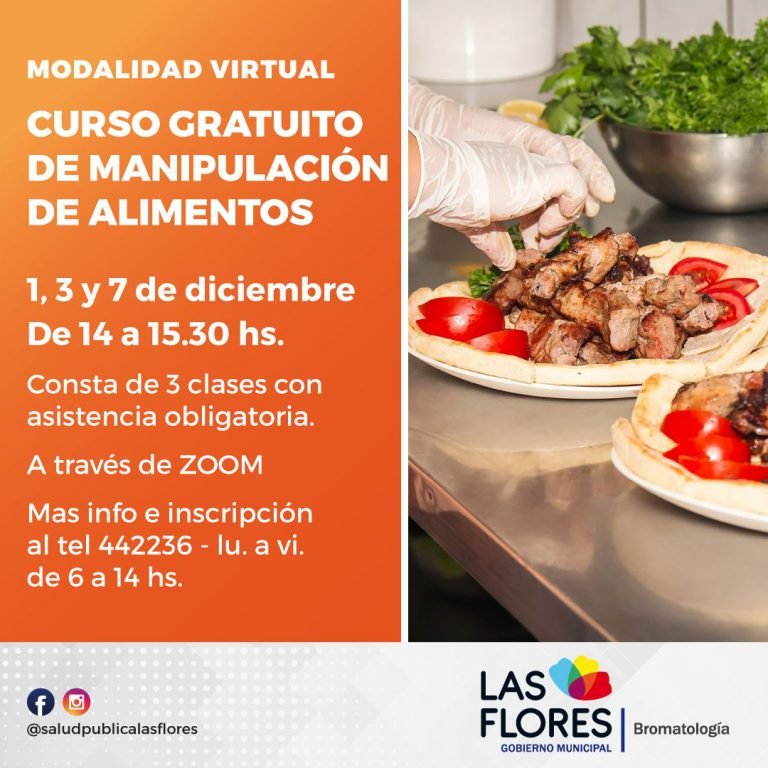 La Dirección de Bromatología recuerda a la población en general que se encuentra abierta la inscripción al nuevo Curso Gratuito de Manipulación de Alimentos, modalidad virtual, que se realizará los días 1, 3 y 7 de diciembre de 14 a 15.30 horas.