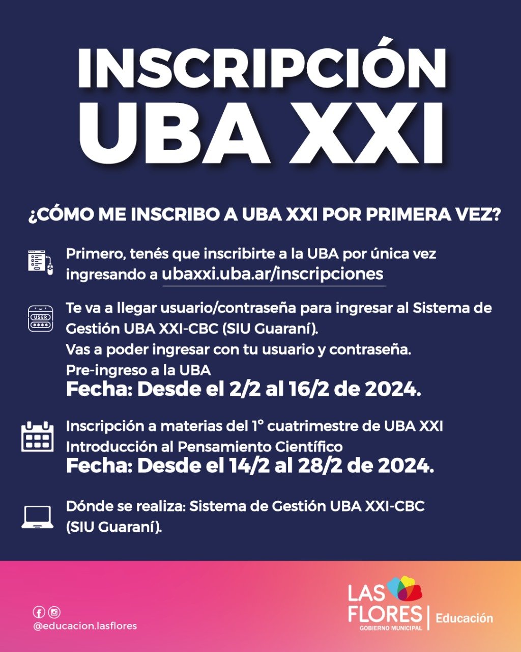 La Secretaría de Educación informa que desde el 2 hasta el 16 de febrero se encuentra abierta la inscripción a la UBA XXI, para quienes se inscriben por primera vez.