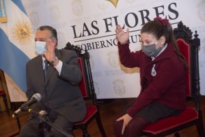 Cada intendente fue acompañado por un alumno, que fue sorteado por la Dirección General de Cultura y Educación Provincial, en nuestro distrito nuestro mandatario fue acompañado por Renata Russo, alumna de la escuela Dante Alighieri.