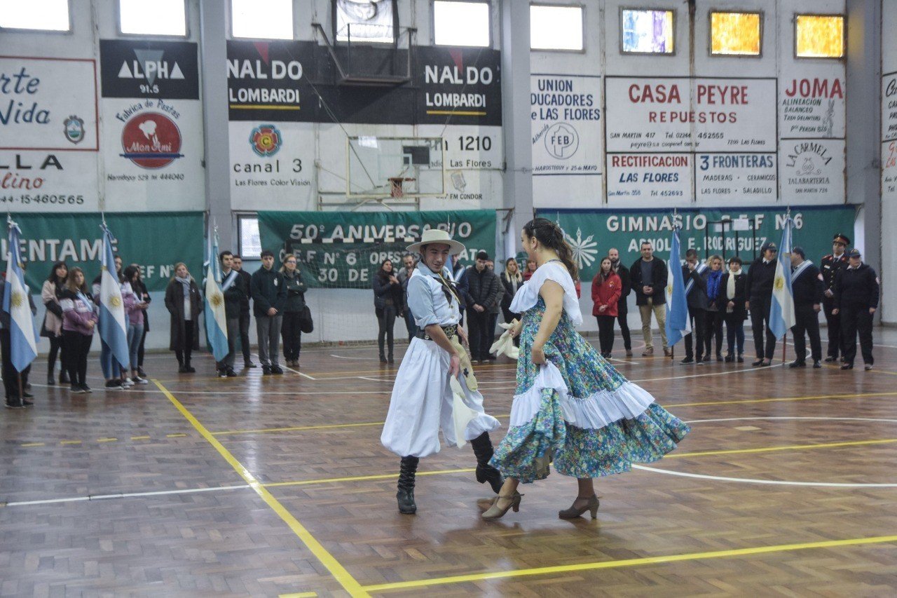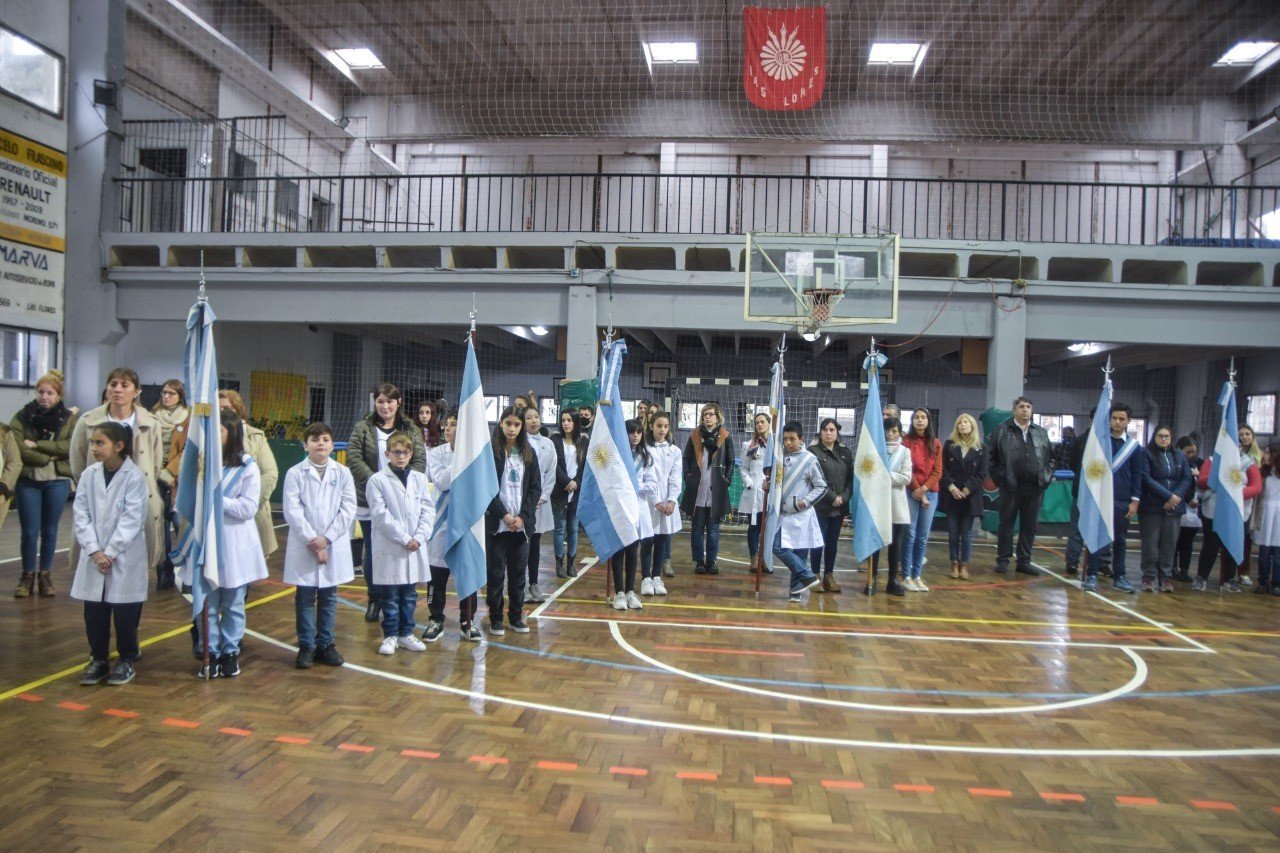 El acto centralizado por este día de la patria se llevó a cabo en las instalaciones del Gimnasio del CEF N° 6 dado que las condiciones climáticas no permitieron su realización en el escenario de la Plazoleta del Barrio 25 de mayo, tal como estaba programado.