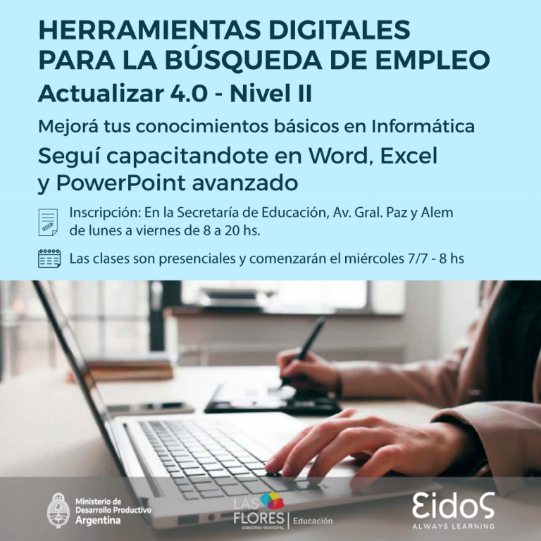 La Secretaría de Educación y la Oficina de Empleo Municipal te invitan a un segundo nivel de capacitación, la misma está destinada a personas que se encuentran en la búsqueda de empleo -sin límites de edad- que quieran mejorar sus competencias digitales y habilidades laborales. En esta capacitación se dictará un módulo de inglés básico, como complemento de la formación.
