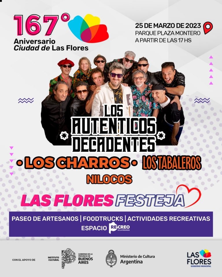 El numero principal de la espectacular fiesta del 167 Aniversario de la ciudad será alrededor de las 21 hs y estará a cargo de “Los Auténticos decadentes”, la exitosa banda tan esperada por nuestra comunidad y la región.