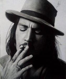 La técnica es dibujo con grafito (lápiz negro) de distintas medidas y el producto final, que es una ilustración de Johnny Deep, es tal que por momentos no se sabe si se trata de una foto o de un dibujo.