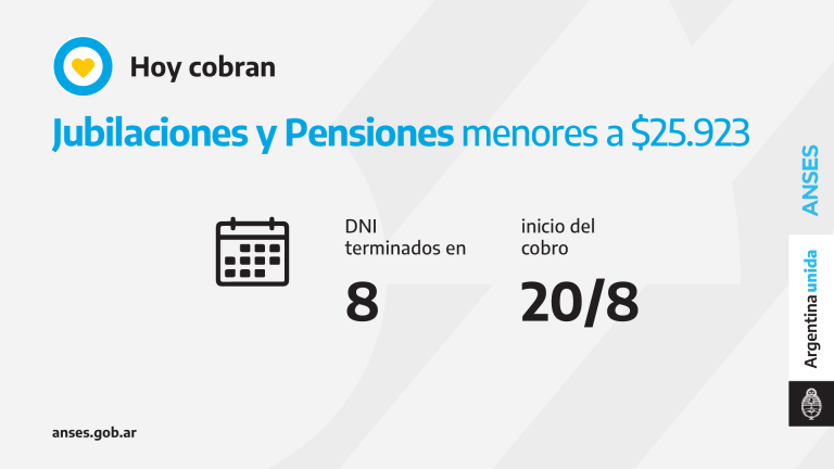 Las sucursales bancarias habilitadas atenderán por ventanilla a jubilados, jubiladas, pensionados y pensionadas con documentos terminados en 8 cuyos haberes NO SUPEREN la suma de 25.923 pesos.