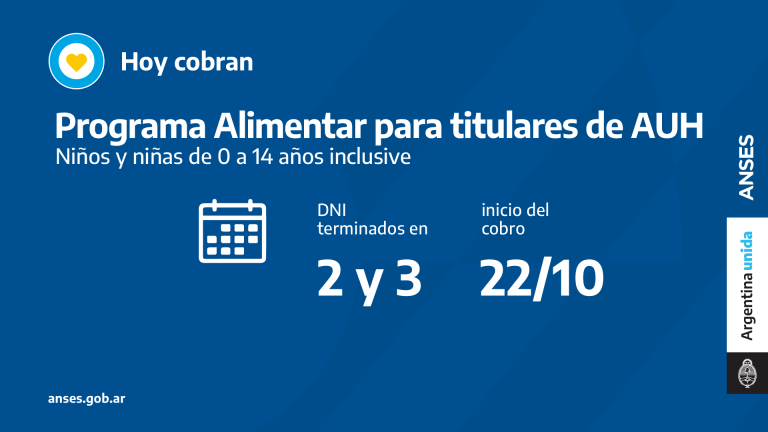 En el marco del Plan Argentina contra el Hambre del Ministerio de Desarrollo Social, ANSES acompaña con el pago del programa Alimentar. Hoy cobran titulares de la AUH con hijos e hijas de 0 a 14 años inclusive con documentos finalizados en 2 y 3, que no poseen la tarjeta plástica y reciben el dinero en la misma cuenta de la prestación.