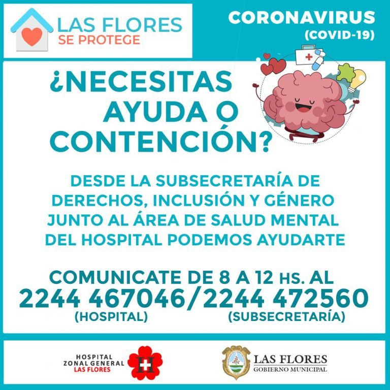 Desde la Subsecretaria de Derechos, Protección y Genero de la Municipalidad de Las Flores, junto al equipo de psicología del Hospital Zonal General de Las Flores, se ha puesto a disposición una línea telefónica para brindar contención psicológica a aquellas personas que requieran de dicha atención.