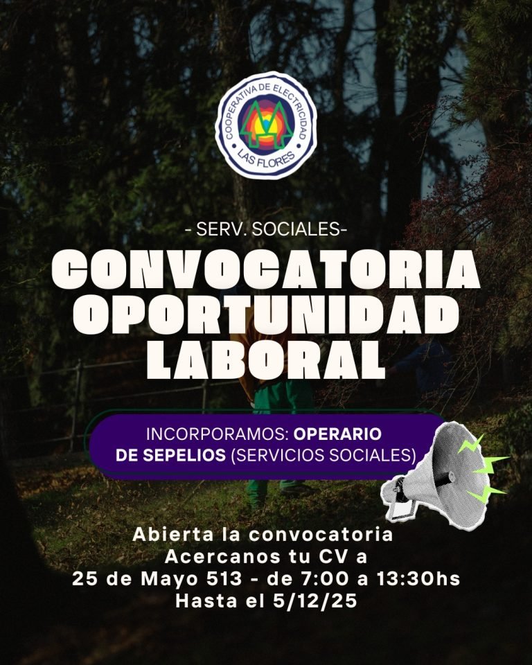 El Consejo de Administración de la Cooperativa de Electricidad de Las Flores Ltda. informa que se encuentra abierta la inscripción para aspirantes a cubrir vacantes en el puesto de Operario de Patio en el área de Servicios Sociales.
