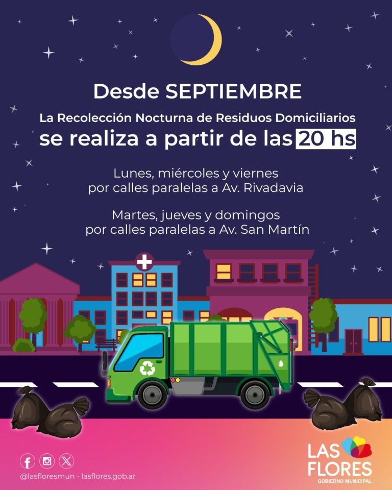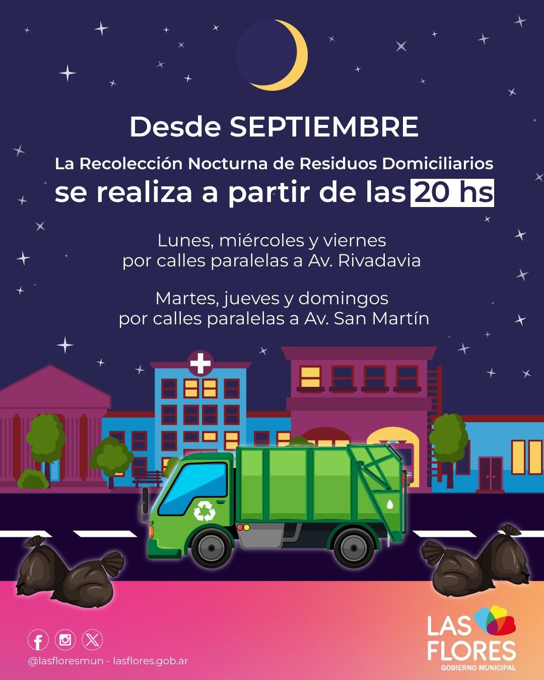 Mediante la Secretaría de Planeamiento, Obras y Servicios Públicos se recuerda a la población que desde este mes la Recolección Nocturna de Residuos Domiciliarios se realiza a partir de las 20 horas.
