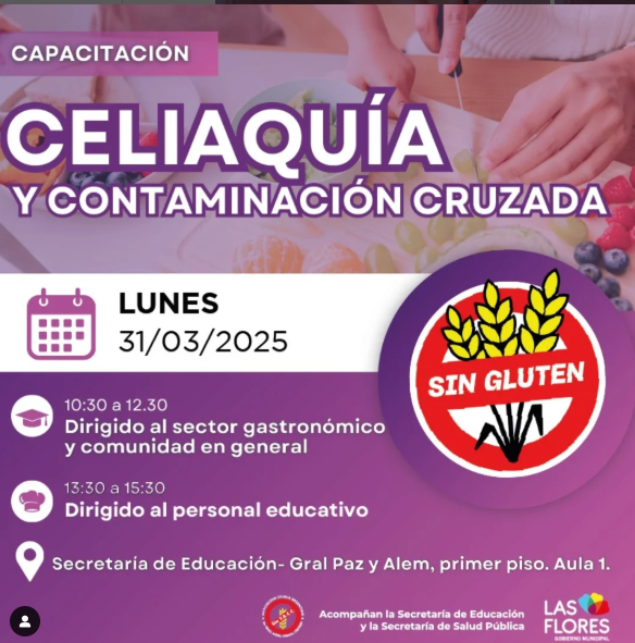 La Asociación Celíaca Las Flores junto a la Secretaria de Salud municipal invitan a la comunidad a ser parte de la capacitación en Celiaquía y contaminación cruzada, orientada alsector gastronómico, personal educativo y público en general.