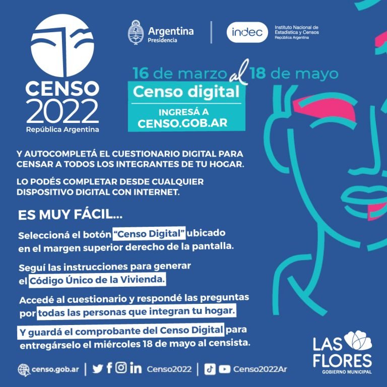 Es por ello que la Secretaría de Educación de la Municipalidad de Las Flores recuerda a la comunidad que en su sede ubicada en Av. Gral. Paz y Alem, 1er. Piso, dispondrá de computadoras y personal de esta dependencia para guiar y asesorar a todas las personas que así lo requieran y pretendan realizar el censo digital a través del proceso autogestionado. Además, se realizará la impresión del comprobante alfanumérico para presentar al censista.