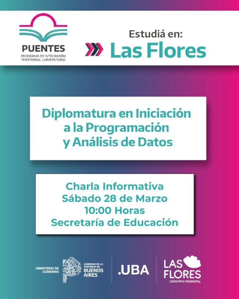 La Secretaría de Educación y Cultura invita a la charla informativa sobre la «Diplomatura en Iniciación a la Programación y Análisis de Datos», que dictará la Universidad de Buenos Aires, en nuestra ciudad; la misma se realizará el sábado 28 de marzo, a las 10 horas en el Centro Universitario, Av. Gral. Paz y Alem, 1er Piso.