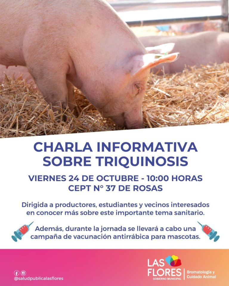 La Dirección de Bromatología y Cuidado Animal invita a toda la comunidad a participar de una charla sobre Prevención de Triquinosis, que se realizará el viernes 24 de octubre a las 10:00 horas en el Centro Educativo para la Producción Total N° 37 (CEPT N° 37) de Rosas.