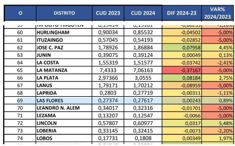 De acuerdo al CUD 2024, el municipio más perjudicado en el reparto de este año será La Matanza, con una caída de 0,37 puntos en el índice, mientras que los municipios que recibirán más dinero que el año pasado en términos porcentuales es General Rodríguez con un 28% más de recursos, seguido por Moreno con 12%.