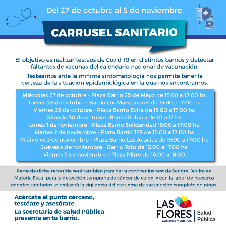 A partir de hoy miércoles 27 de octubre la Secretaría de Salud Pública comienza la campaña CARRUSEL SANITARIO, cuyo principal objetivo será realizar testeos de Covid-19 en distintos barrios y detectar faltantes de vacunas del calendario nacional de vacunación.