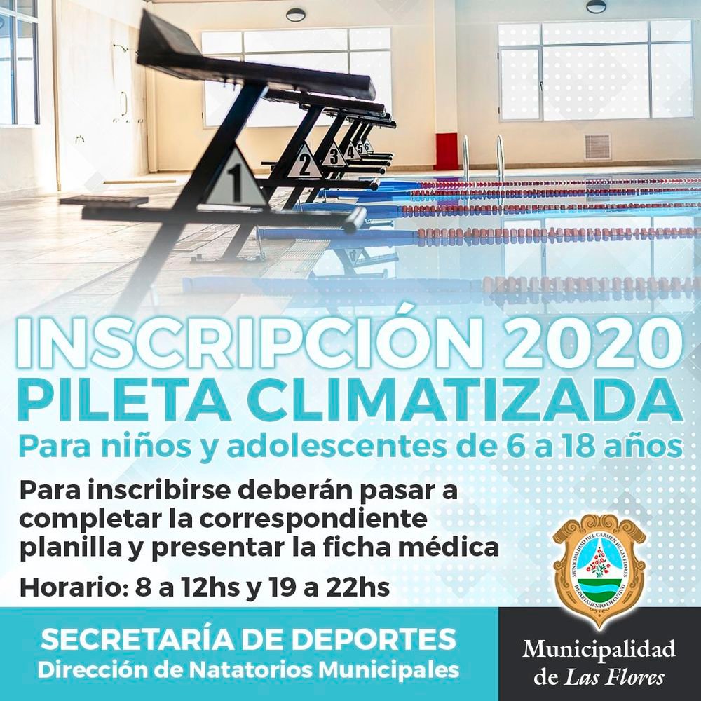 La Dirección de Natatorios Municipales dependiente de la Secretaría de Deportes, informa a la comunidad que desde el próximo lunes estará abierta la inscripción para el ciclo 2020, para los niños y adolescentes desde los 6 a los 18 años de edad.