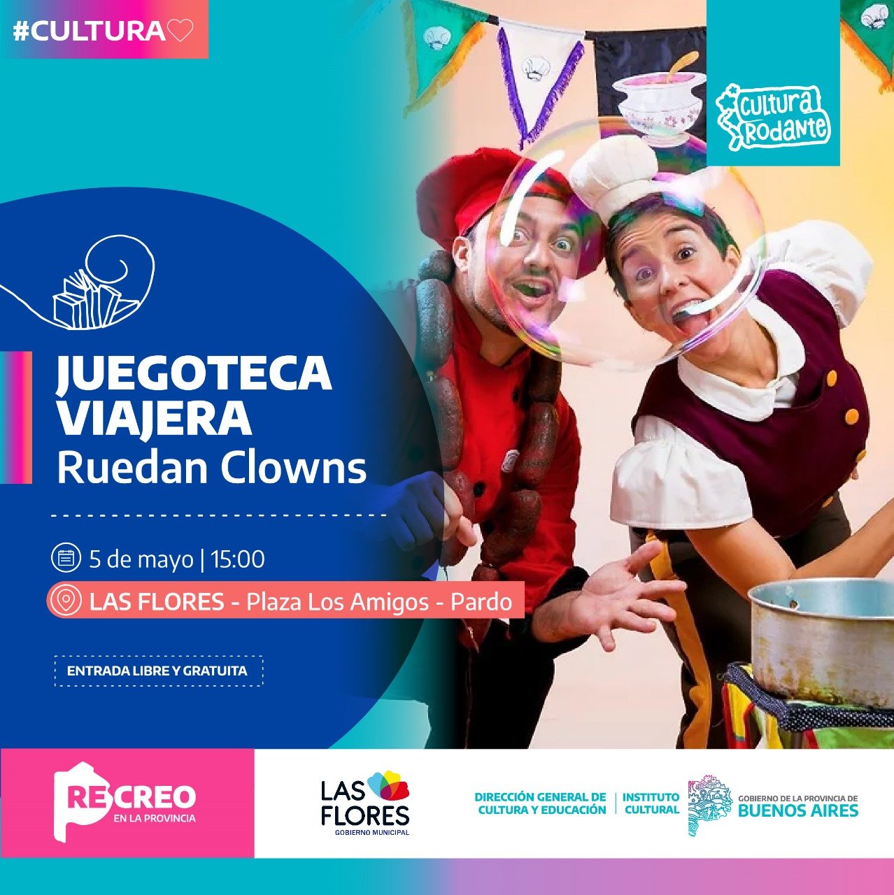 Este domingo 5 de mayo, Cultura Rodante llega a la localidad de Pardo, en nuestro Partido de Las Flores, junto a la ya clásica Juegoteca Viajera, sus espacios de arte, juegos y lectura, y el show del Ruedan Clowns. La entrada es libre y gratuita.