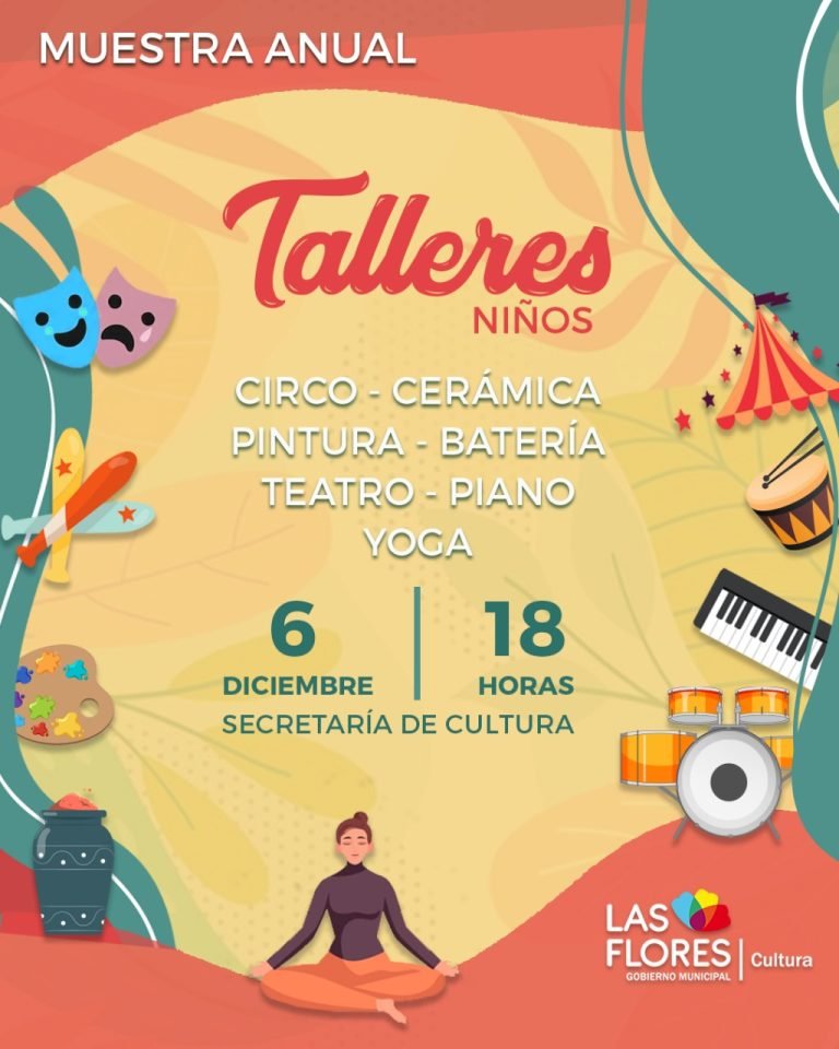 Esta tarde desde las 18 horas, continuando con las muestras de talleres, se ha programado la jornada de cierre de siete disciplinas artísticas para niños y niñas que forman parte del interesante programa diseñado por la Secretaría de Cultura durante el año. Los Talleres de Piano, Cerámica, Pintura, Teatro, Circo y Yoga son los que exhibirán sus avances alcanzados.