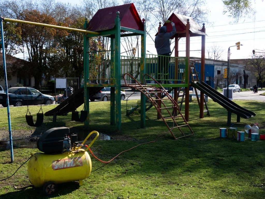 Además, se concretan tareas de embellecimiento que comprenden pintura de juegos, de la pista de patinaje, entre otros, en la Plazoleta del Club de Leones.