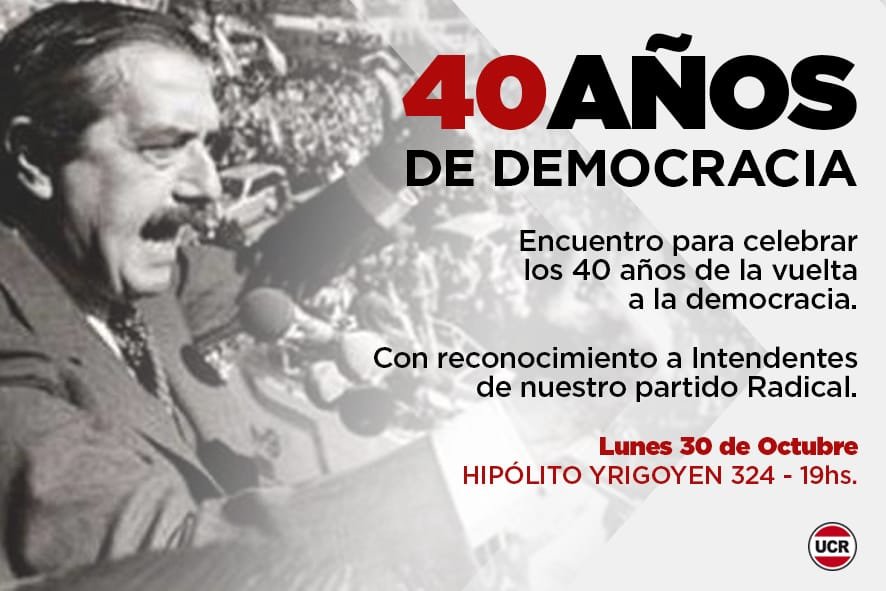 El comité Radical de Las Flores invita a toda la comunidad al encuentro partidario que se realizará hoy a las 19 hs con motivo de la celebración del 40 aniversario de la vuelta a la democracia.