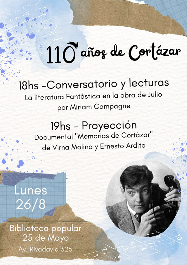 El lunes 26 de agosto, a las 18 hs, en la Biblioteca Popular 25 de Mayo, se hará la  presentación de “Cortázar fantástico: una introducción a la literatura del género y lectura de cuentos del autor..