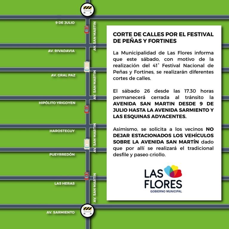 La Municipalidad de Las Flores informa que este sábado, con motivo de la realización del 41° Festival Nacional de Peñas y Fortines, se realizarán diferentes cortes de calles.