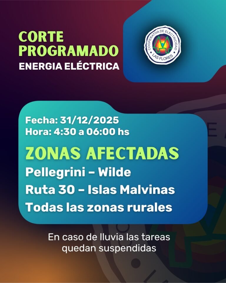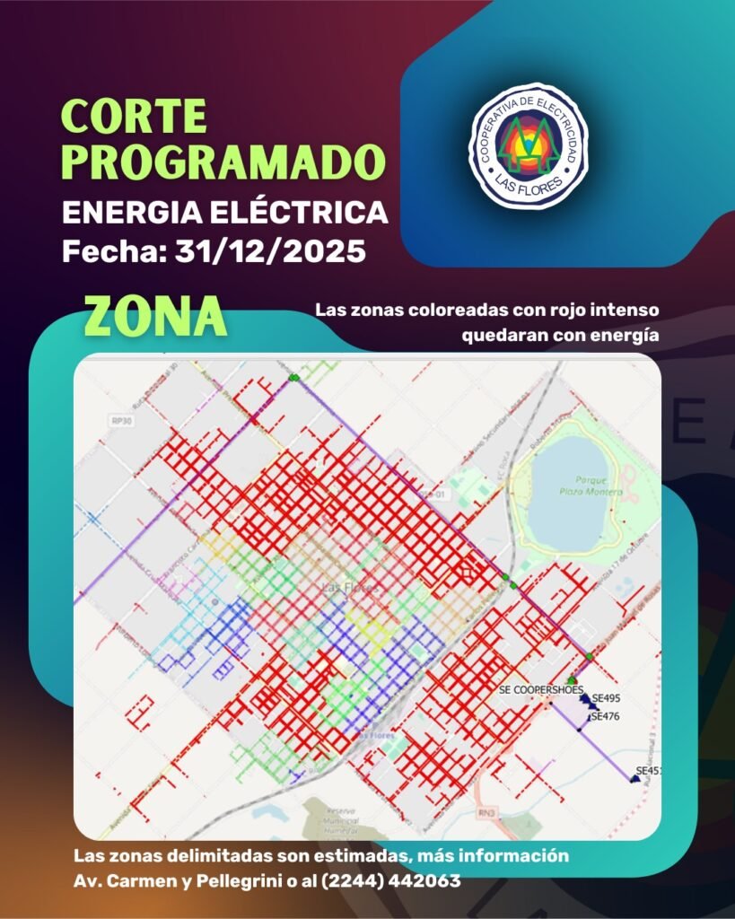 La Cooperativa de Electricidad de Las Flores informa a sus asociados que el día miércoles 31 de diciembre de 2025, en el horario de 04:30 a 06:00 horas, se realizará un corte programado de energía eléctrica con el objetivo de llevar adelante tareas de mantenimiento preventivo en la red.