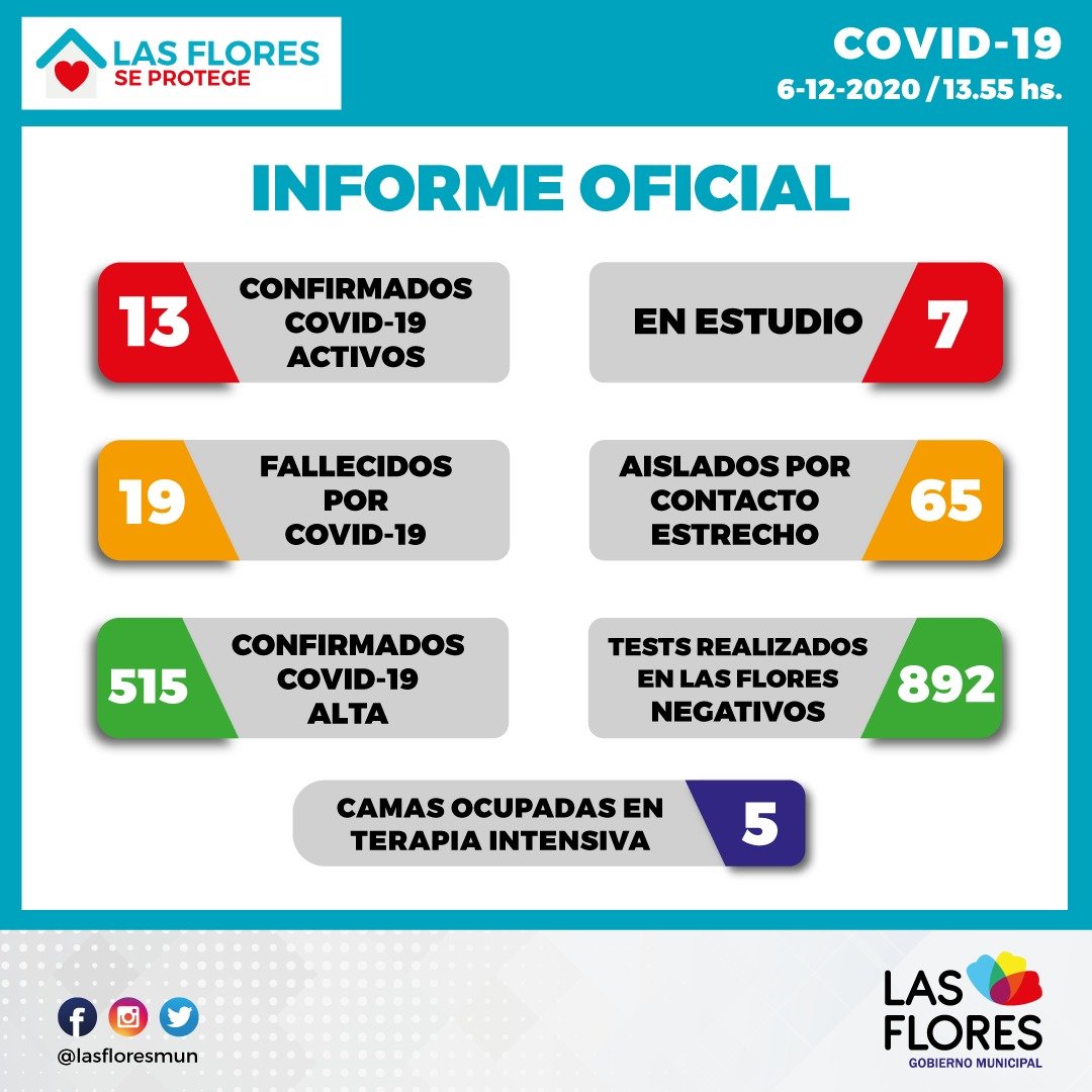 En el día de hoy ingresaron nuevos resultados, arrojando 4 positivos, 3 por medio de hisopado PCR y 1 por test de antígeno, anosmia y 5 resultados negativos.