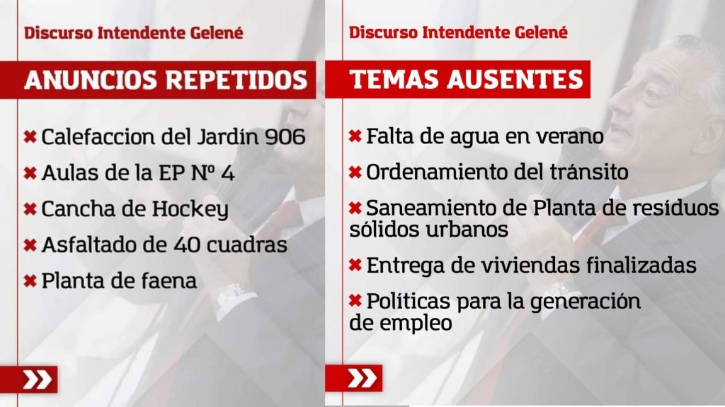 En un discurso lavado, con más repaso de lo hecho que con proyección hacia el futuro, y delegando responsabilidades en el gobierno Nacional, el intendente pasó por alto temas que son prioritarios y urgentes para nuestra ciudad, como lo son la falta de agua en gran parte de la ciudad en los meses de altas temperaturas; el reordenamiento del tránsito, aún contando con ordenanzas ya aprobadas por el HCD; la necesidad de políticas productivas que alienten el empleo privado; y la de entrega de viviendas terminadas, en un contexto de emergencia habitacional.