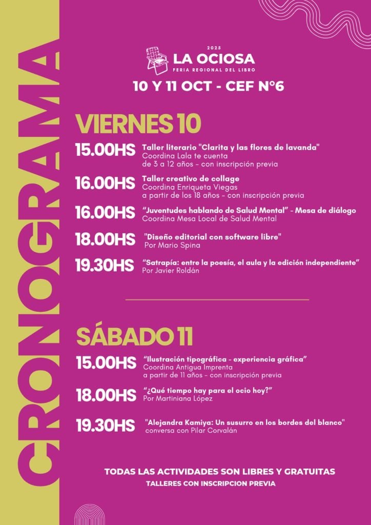 La Feria Regional del Libro y Artes Gráficas “LA OCIOSA”, se realizará el 10 y 11 de octubre en el CEF N°6. Van a poder disfrutar de talleres gratuitos, charlas, lecturas, arte y encuentros con escritoras, artistas, librerías y editoriales.