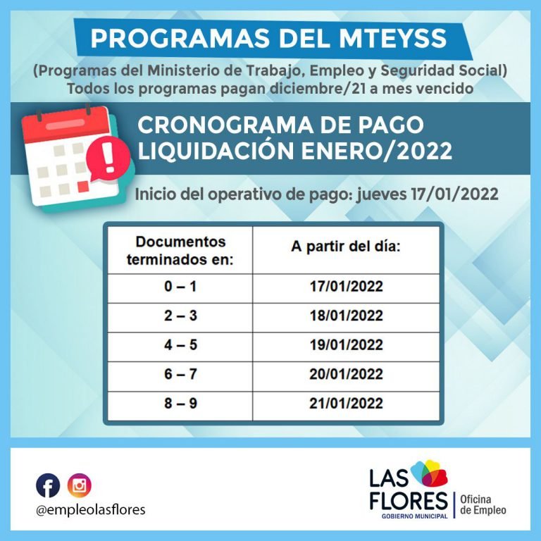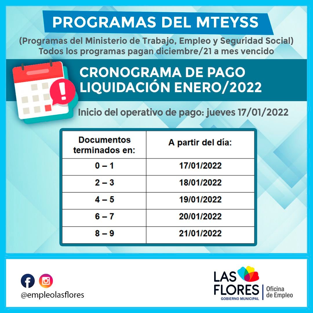 La Oficina Municipal de Empleo informa a los beneficiarios de los Programas Joven y de Entrenamiento, dependientes del Ministerio de Trabajo, Empleo y Seguridad Social, el calendario de pago del mes de diciembre, cuyo operativo de pagos comenzará el lunes 17/01/22, de acuerdo al siguiente cronograma de documentos terminados en: