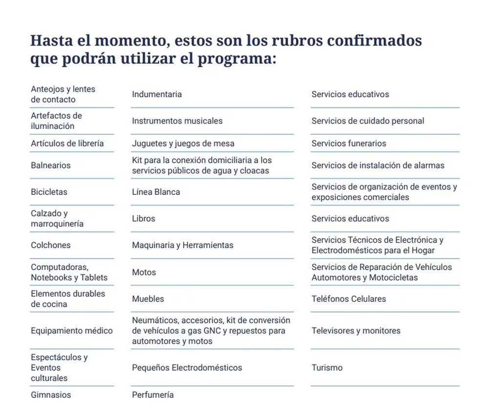 El Gobierno definió los detalles del nuevo programa para impulsar el consumo que reemplazará al icónico Ahora 12 a partir de febrero. Se llamará “Cuota Simple” y ofrecerá financiamiento en 3 y 6 cuotas. La tasa de interés sería del 77,2% nominal anual, equivalente al 85% de la que tiene como referencia para los plazos fijos el Banco Central de la República Argentina (BCRA), aunque este punto se encuentra aún en negociación porque es resistido por los bancos. Hasta el momento hay 34 rubros confirmados para realizar compras bajo este nuevo esquema entre los que se encuentran indumentaria, electrodomésticos y turismo.