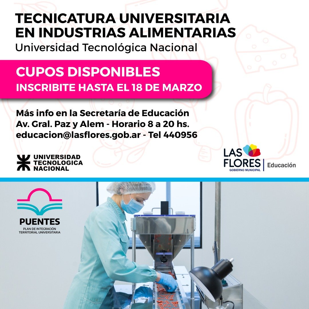 La Secretaría de Educación informa que existen cupos disponibles para la Tecnicatura en Industrias Alimentarias de la Universidad Tecnológica Nacional (UTN) que se desarrolla en nuestra ciudad.
