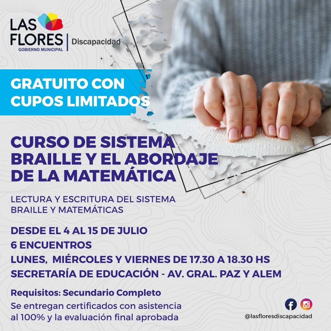 La Dirección de Discapacidad dependiente de la Secretaría de Desarrollo Humano, informa que está abierta la inscripción al Curso de Sistema Braille y el Abordaje de la Matemática que inicia el próximo 4 de julio.
