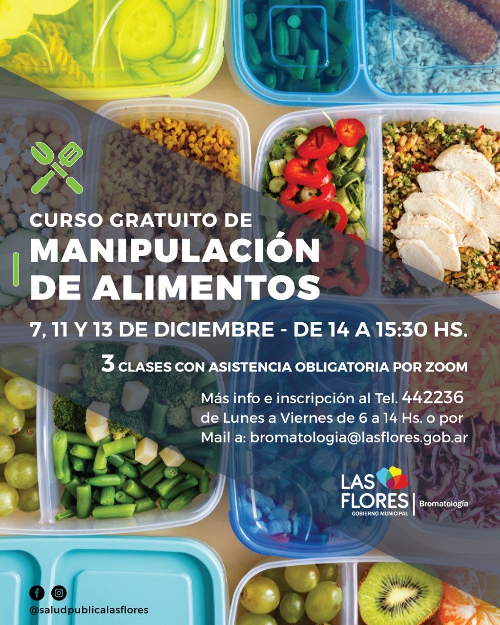 La Dirección de Bromatología informa a la población en general que se encuentra abierta la inscripción al Curso Gratuito de Manipulación de Alimentos – modalidad virtual, que se realizará los días 7, 11 y 13 de diciembre de 14 a 15:30 horas.