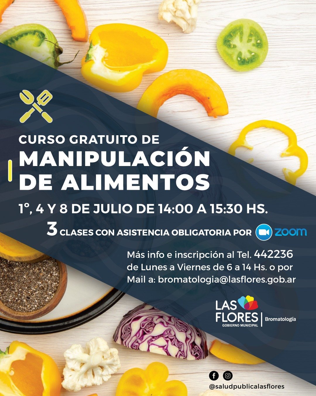 La Dirección de Bromatología informa a la población en general que se encuentra abierta la inscripción al Curso Gratuito de Manipulación de Alimentos – modalidad virtual, que se realizará los días 1, 4 y 8 de julio de 14 a 15.30 horas.