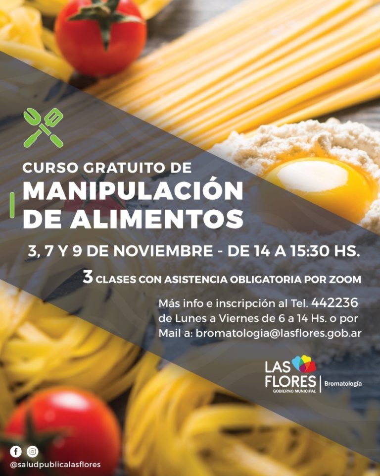 La Dirección de Bromatología informa a la población en general que se encuentra abierta la inscripción al Curso Gratuito de Manipulación de Alimentos – modalidad virtual, que se realizará los días 3, 7 y 9 de noviembre de 14 a 15.30 horas.