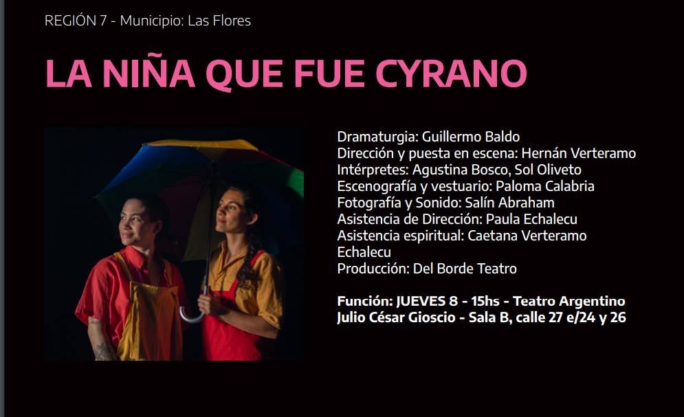 Esta semana comienza la 37º Fiesta Provincial del Teatro, a realizarse en la ciudad de Mercedes. Allí  estará Teatro Del Borde representando a la Región 7 con «La niña que fue Cyrano», obra dirigida por Hernán Verteramo. La presentación será el JUEVES 8, a las 15hs en el Teatro Argentino, Julio César Gioscio – Sala B, calle 27 e/24 y 26.