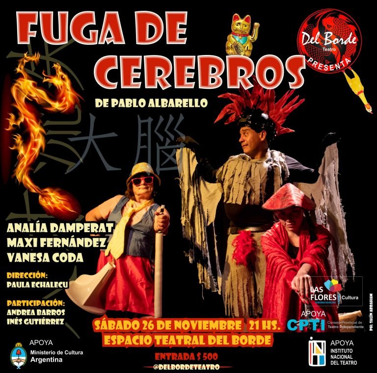 El próximo sábado 26 de noviembre a las 21 Hs., en el Espacio Teatral Del Borde, se estrenará el espectáculo humorístico Fuga de Cerebros, basado en texto original de Pablo Albarello, con actuaciones de Analía Damperat, Maximiliano Fernández y Vanesa Coda, con participaciones especiales de Andrea Barros y María Inés Gutiérrez, acompañados por la dirección de Paula Echalecu.